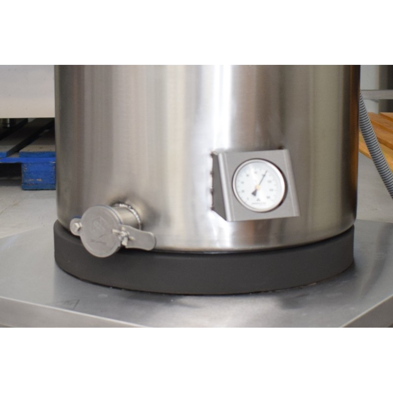 The cooking boiler is equipped with a jacket for heating as well as a heating system, an electrically driven stirrer (with a geared motor) and Teflon scrapers, which allow for the processing of products with low to medium viscosity. The cooking device is also equipped with a vacuum system.