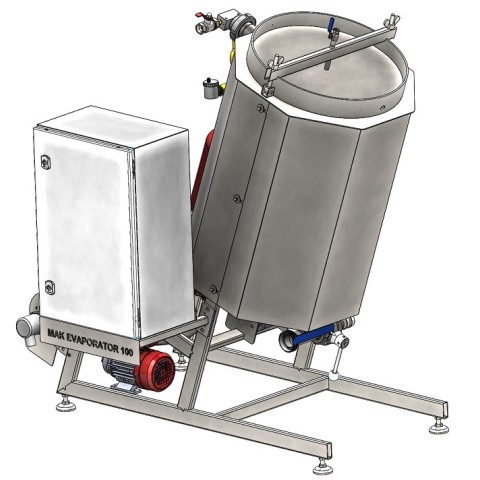 La unidad de evaporación al vacío consta de un recipiente de vacío inclinado de una sola capa sobre una estructura de soporte, equipado con un circuito de circulación externo con una bomba de producto y un intercambiador de calor, un sistema de generación de vacío (un eyector de aire comprimido) y un sistema de recolección y extracción de vapor secundario. Los controles dependen del tipo y de los parámetros de automatización requeridos.