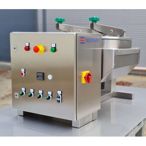 La configuration de base de l'installation consiste en une cuve de travail cylindrique compacte montée sur une structure de support avec un panneau de commande. Elle est équipée d'un chauffage électrique par le bas, d'un panier spécial amovible monté sur un arbre, d'un système de vide, d'un système d'évacuation et de condensation de la vapeur, d'une centrifugeuse et d'un système d'inclinaison de la cuve de travail. La commande semi-automatique permet de régler le système de chauffage, la production de vide et la rotation du panier. Dans la version de base, le basculement est mécanique.