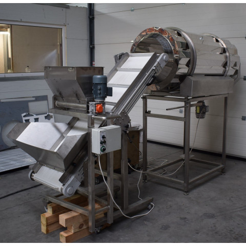 Unité à tambour rotatif conçue pour les opérations d'enrobage et d'assaisonnement en continu ainsi que pour la saturation des produits avec des épices et des additifs aromatiques, utilisée dans les lignes de production de chips, de snacks et de divers produits semi-finis.