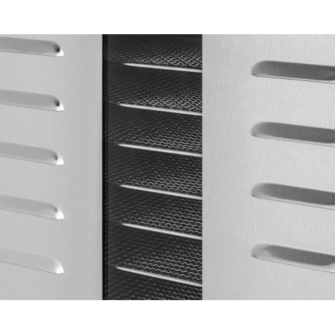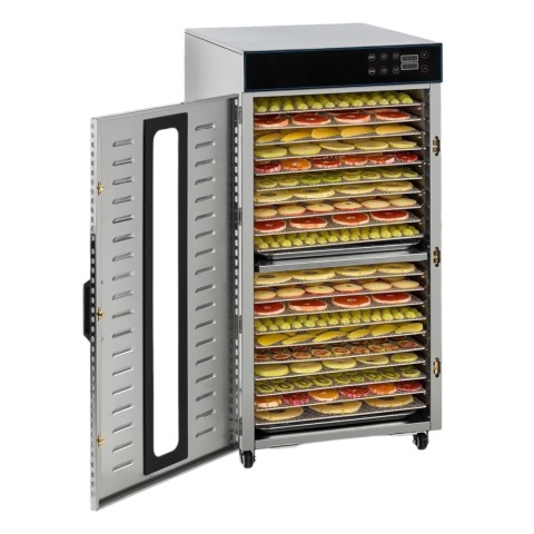 - Groot model (droogoppervlak van 7 m²) – Ontworpen voor hogere productievolumes, bevat het 48 zeefplanken en een krachtiger verwarmingssysteem van 4 kW, wat grotere batchverwerking mogelijk maakt. Dit model is verdeeld in twee grotere droogkamers, wat het beheer van de luchtstroom verbetert en een flexibelere verwerking van verschillende voedselproducten mogelijk maakt.