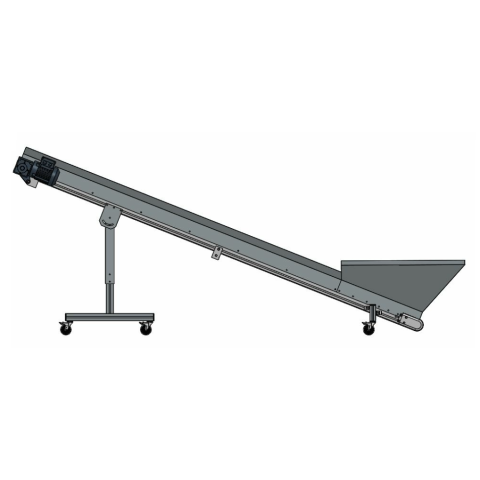 Uniwersalny przenośnik z taśmą PVC z poziomymi sekcjami, magazynem objętościowym, regulowaną wysokością i kątem nachylenia, który można łatwo dostosować do istniejących instalacji w celu podniesienia produktu na określoną wysokość. Przenośnik posiada własny niezależny napęd, którego prędkość można regulować za pomocą falownika (opcja).